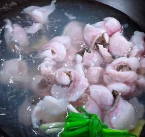 “Bring a pot of water to a boil. Add green onions, ginger, and cooking wine. Then, add the marinated fish slices, cook for 2 minutes, remove, and set aside.”