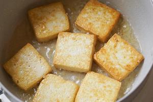 Heat a flat-bottomed pan over medium heat and add 2 tablespoons of cooking oil. Place 300g of firm tofu (cut into thick slices) in the pan, arranging them in a single layer. Pan-fry for about 40 seconds on each side until golden brown. Remove from the pan and set aside.