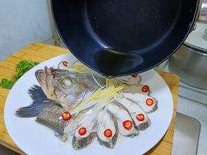 Remove the broth from the steamed fish, along with the chopped scallions and ginger slices. Add shredded scallions, shredded ginger, and chopped chili peppers.