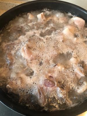 After cleaning the duck, cut it into pieces and blanch in boiling water. Once the water boils, skim off the foam.