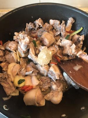 After stir-frying the scallions, ginger, chili, and onion until fragrant, add the duck meat. Give it a quick stir, then add sugar. I use rock sugar, but regular white sugar works too.