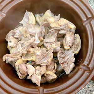 The duck was chopped into small pieces; I used half a female Muscovy duck.