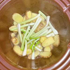 Pour sesame oil into the clay pot. Once the oil is hot, add the ginger and scallion whites, and stir-fry until fragrant. Feel free to use a generous amount of sesame oil here!