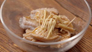 Score the surface of the abalone in a cross-hatch pattern (flower cut). Marinate with shredded ginger, salt, and cooking wine (or Shaoxing wine) for 10 minutes.