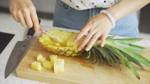 Halve the pineapple lengthwise. Selecting the smaller side, meticulously hollow it out, reserving the whole fruit chunks. Don’t forget to keep the scattered碎 pieces and juice! Remove the tough core from the fruit, and set the pineapple boat aside.