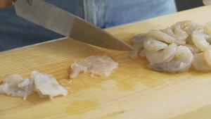 Flatten the shrimp with the back of your knife to break down the fibers, then mince it lightly.