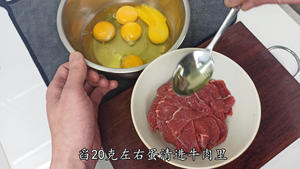 After that, whisk 5 eggs and add about 20g of egg white to the beef.”