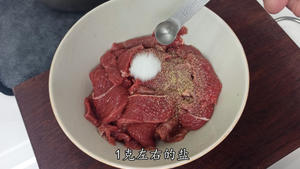 “First, mix well by hand until the beef has absorbed all the liquid. Then, add a pinch of pepper, about 1g of salt, 5g of soy sauce, and 5g of cooking wine. Mix thoroughly again.”