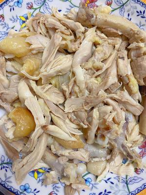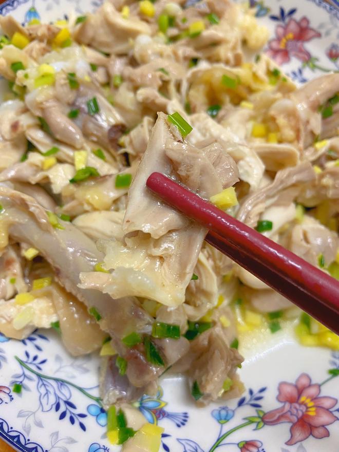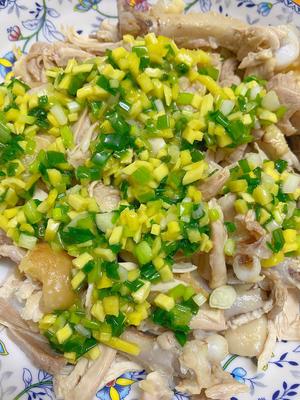 “Pour the ginger-scallion sauce over the shredded chicken. You don’t have to use all the oil—just to your liking.”